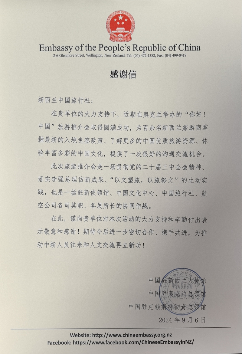 近日,中旅旅行所屬新西蘭中旅收到中國駐新西蘭大使館、中國駐奧克蘭總領(lǐng)館、中國駐克萊斯特長期總領(lǐng)館聯(lián)名感謝信。中國駐新西蘭大使館等單位對新西蘭中旅在奧克蘭舉辦的“你好!中國”旅游推介會中提供的支持表示感謝,并期待今后與新西蘭中旅進一步密切合作,為推動中新人文交流和人員往來再立新功。