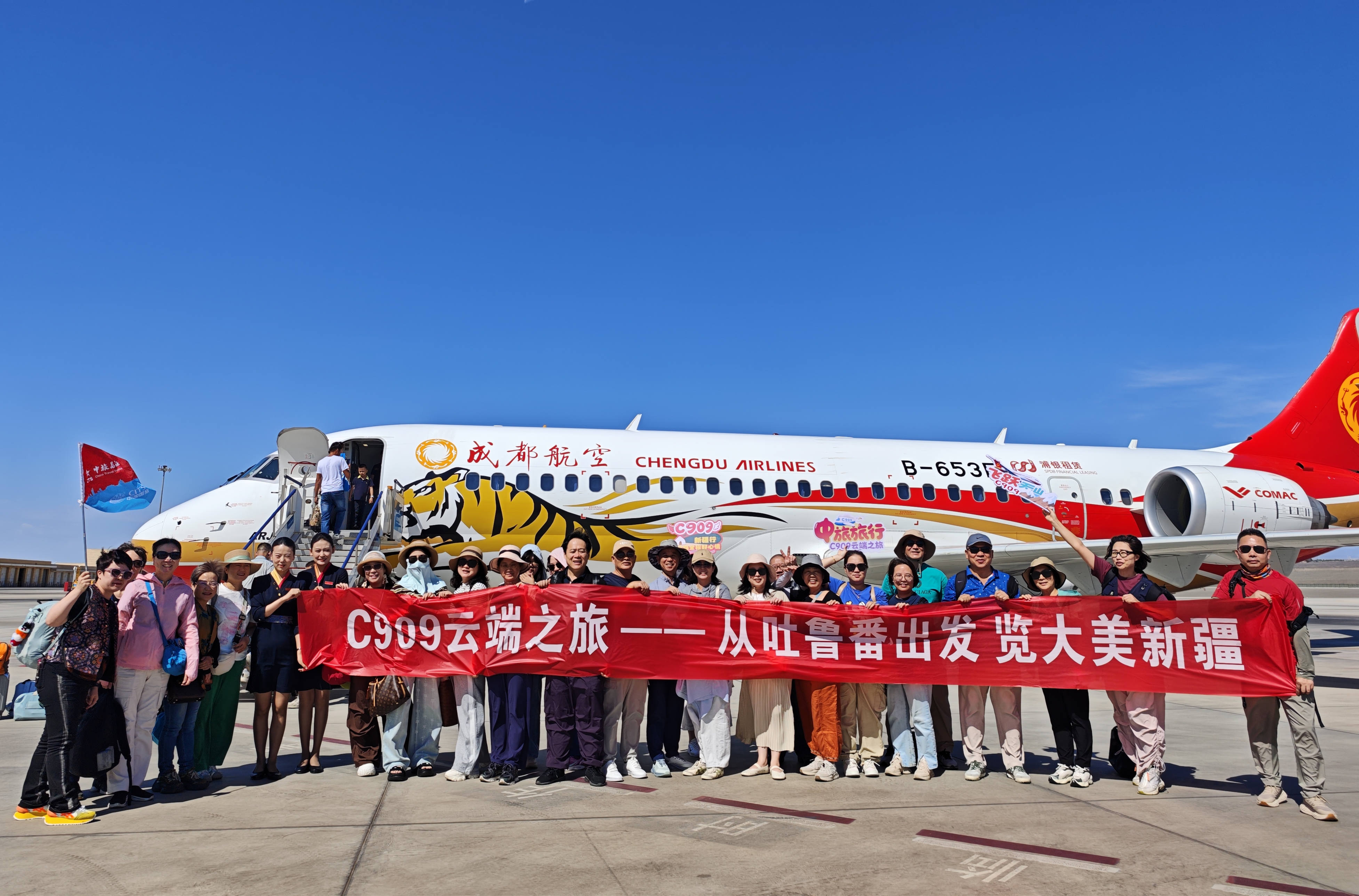 8月16日,由中旅旅行攜手中國商飛、成都航空共同策劃的“C909云端之旅”新疆旅游首發(fā)儀式在吐魯番市成功舉行。來自全國各地的27名旅客組成首發(fā)團(tuán),率先搭乘C909環(huán)疆快線,開啟“獨庫北疆4飛10日游”特色路線,成為“航空+文旅”創(chuàng)新模式的首批體驗者。