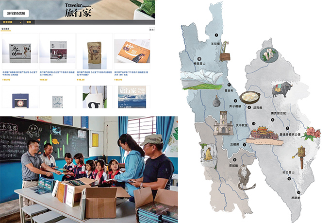 圖1-3:旅行家淘寶店扶貧產(chǎn)品;孩子們領(lǐng)取贈書;「時光之禮」旅游路線