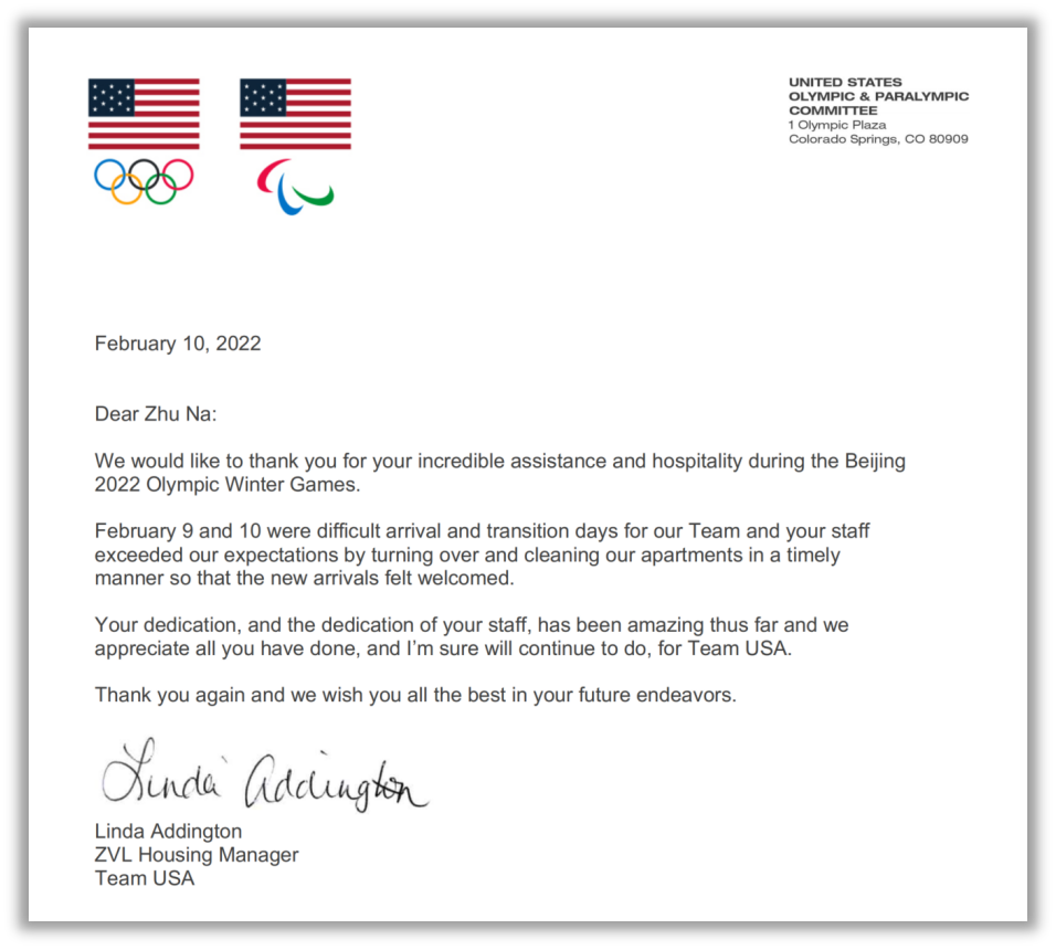 2月11日,中旅冬奧服務(wù)團隊收到美國代表團官方感謝信,感謝2號院團隊在北京維景國際大酒店徐娜和長春國盛維景酒店朱娜的帶領(lǐng)下,在美國隊運動員大范圍轉(zhuǎn)場這一復(fù)雜的過渡期,扛住壓力在極短時間內(nèi)讓房間煥然一新。信中寫道,中旅冬奧服務(wù)團隊的服務(wù)讓他們感受到了歡迎和熱情,感謝團隊為此所做的努力,并為此送上誠摯的祝福。