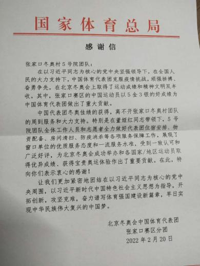 2月20日,北京冬奧會中國代表團(tuán)張家口賽區(qū)分團(tuán)專致紅頭感謝信,表達(dá)了對中旅服務(wù)團(tuán)隊(duì)的感謝。信中寫到:“中國代表團(tuán)冬奧佳績的獲得,離不開張家口冬奧服務(wù)團(tuán)隊(duì)的周到服務(wù)和大力支持。”信中特別感謝了中旅投資咸陽海泉灣派出的骨干董婭紅帶領(lǐng)的5號院服務(wù)團(tuán)隊(duì),贊賞其為冬奧會及冬奧運(yùn)動會提供了優(yōu)質(zhì)的服務(wù)、做出了重要貢獻(xiàn)。