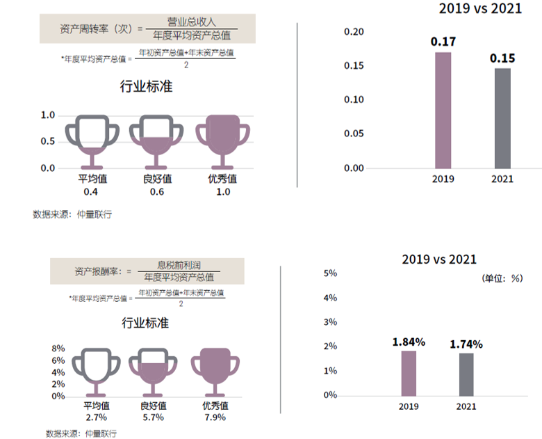 本次調(diào)研結(jié)果顯示出,受疫情影響,多項數(shù)據(jù)指標(biāo)均出現(xiàn)下滑。其中反映酒店運營管理和資產(chǎn)管理水平的資產(chǎn)周轉(zhuǎn)率和資產(chǎn)報酬率,在2021年均低于國資委考核分配局編制的《企業(yè)績效評價標(biāo)準(zhǔn)值》中記載的住宿和餐飲業(yè)全行業(yè)的平均值。