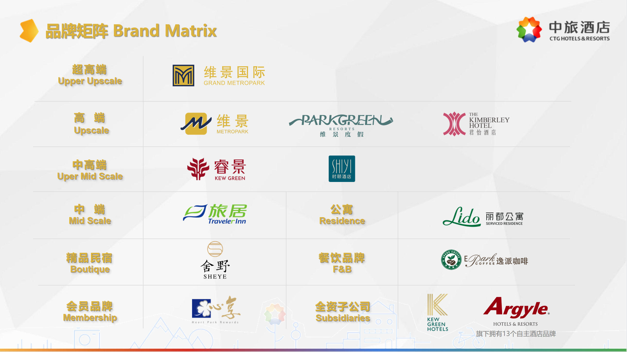公司擁有“維景國際”“維景”“睿景”“旅居”“麗都公寓”“舍野”“雅閣”“澳斯特”等品牌,覆蓋超高端、高端、中高端、中端、公寓、民宿等各類產(chǎn)品線。