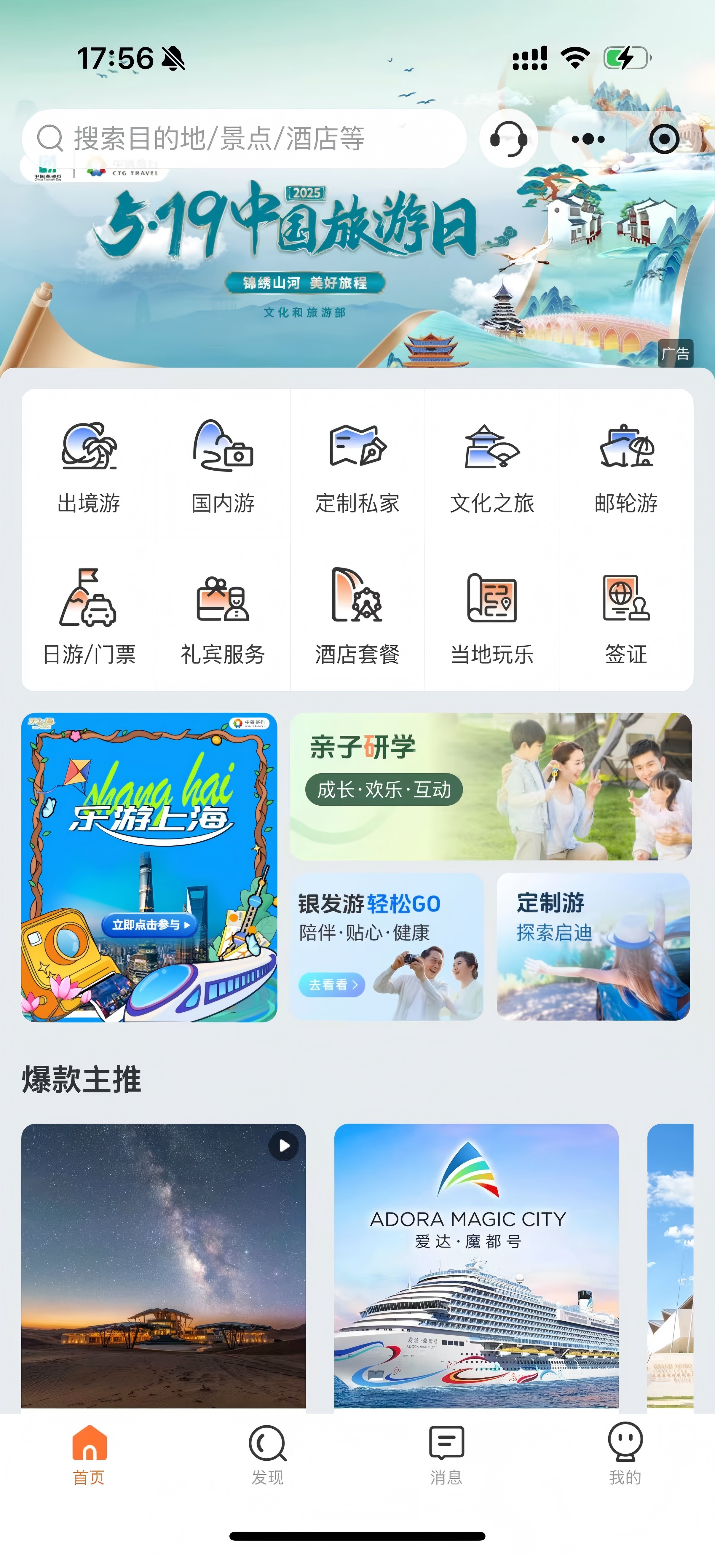 “中旅旅行”線上銷售平臺包括PC網(wǎng)(www.ourtour.com)、App和小程序,提供國內(nèi)及出境跟團游、自由行、定制游、郵輪、機票、酒店、簽證等旅游產(chǎn)品一站式服務(wù)?!爸新寐眯小睂⒅新谩谩⒏壑新萌笃放频膬?yōu)質(zhì)旅游資源進行整合,進行統(tǒng)一的展現(xiàn)和銷售;整合集團內(nèi)維景酒店、星旅郵輪、景區(qū)、旅游金融等優(yōu)質(zhì)資源,升級具有核心競爭力的自有產(chǎn)品體系,滿足消費者的美好出行需求。